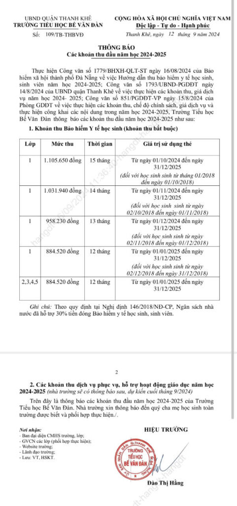 Các khoản thu đầu năm học 2024-2025 Đã đăng trên 7 Tháng 1, 20257 Tháng 1, 2025 bởi Biên tập Biên tập Phòng Giáo dục – Đào tạo quận Thanh Khê về kiểm định chất lượng giáo dục tại trường Tuyển sinh lớp 1 – Năm học 2024-2025