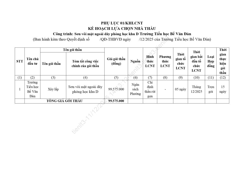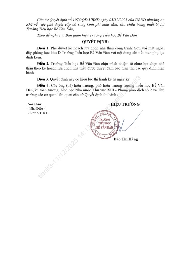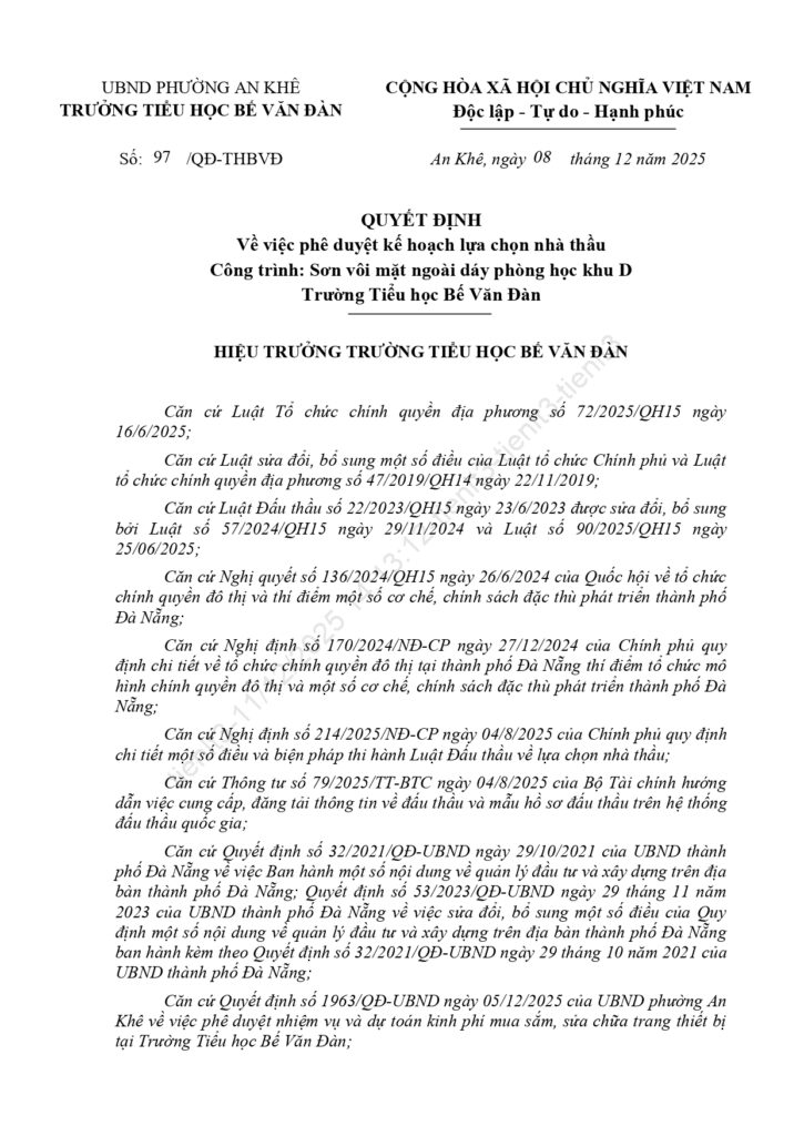 QUYẾT ĐỊNH (QĐ 97): Về việc phê duyệt kế hoạch lựa chọn nhà thầu Công trình: Sơn vôi mặt ngoài dãy phòng học khu D Trường Tiểu học Bế Văn Đàn Đã đăng trên 8 Tháng 12, 202517 Tháng 12, 2025 bởi Biên tập Biên tập ỦNG HỘ CÁC BẠN HỌC SINH TẠI CÁC TRƯỜNG VÀ ĐỊA PHƯƠNG CHỊU ẢNH HƯỞNG MƯA LŨ THÔNG BÁO: Thực đơn bán trú tuần 14