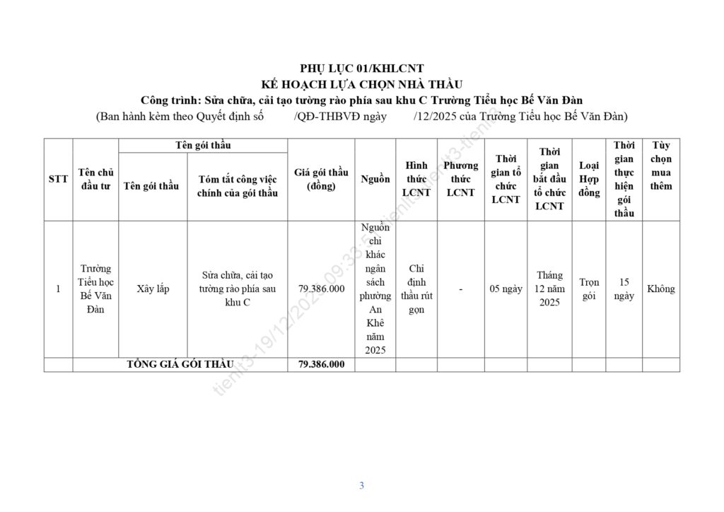 QUYẾT ĐỊNH Về việc phê duyệt kế hoạch lựa chọn nhà thầu Công trình: Sửa chữa, cải tạo tường rào phía sau khu C Trường Tiểu học Bế Văn Đàn Đã đăng trên 16 Tháng 12, 20255 Tháng 1, 2026 bởi Biên tập Biên tập THÔNG BÁO: Thực đơn bán trú tuần 15 Buổi sinh hoạt dưới cờ : Đón các chú bộ đội Tiểu đoàn Đặc công 409 về giao lưu cùng các em học sinh nhân kỉ niệm 81 năm ngày thành lập Quân đội Nhân dân Việt Nam