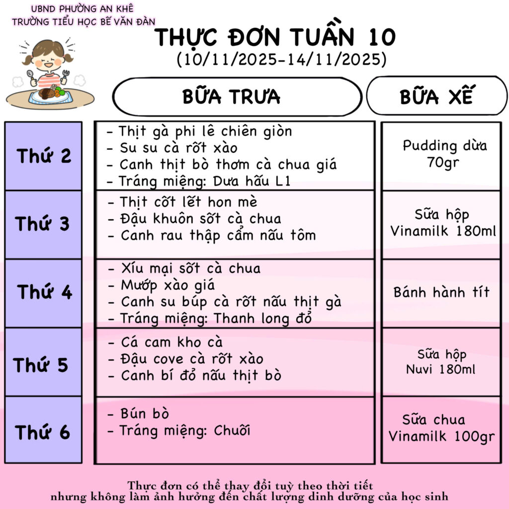 THÔNG BÁO: Thực đơn bán trú tuần 10 Đã đăng trên 10 Tháng mười một, 2025 bởi Biên tập Biên tập THÔNG BÁO: Thực đơn bán trú tuần 9 LỄ KỶ NIỆM 40 NĂM THÀNH LẬP TRƯỜNG TIỂU HỌC BẾ VĂN ĐÀN (1985–2025)
