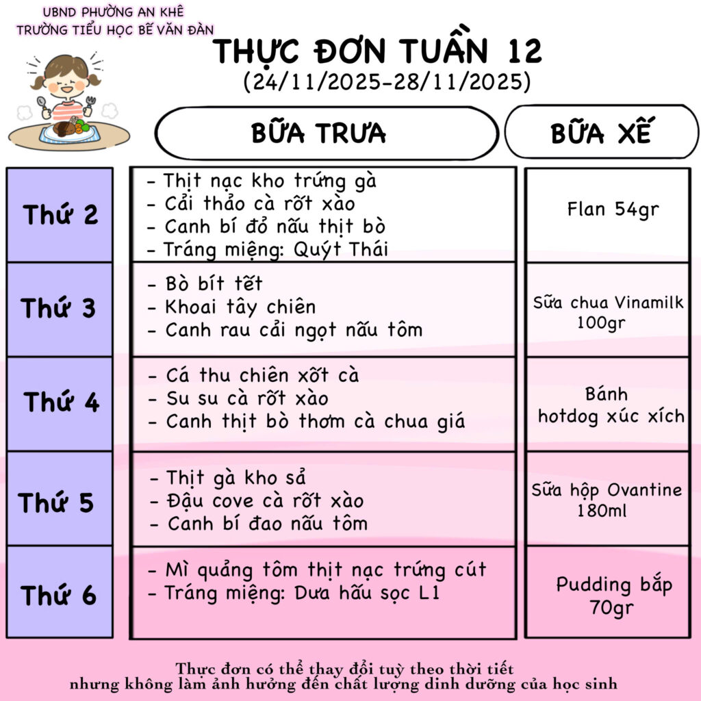 THÔNG BÁO: Thực đơn bán trú tuần 12 Đã đăng trên 24 Tháng mười một, 2025 bởi Biên tập Biên tập THÔNG BÁO: Thực đơn bán trú tuần 11 THÔNG BÁO: Thực đơn bán trú tuần 13