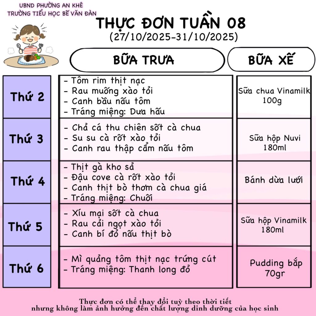 THÔNG BÁO: Thực đơn bán trú tuần 8 Đã đăng trên 27 Tháng 10, 2025 bởi Biên tập Biên tập THÔNG BÁO: Thực đơn bán trú tuần 7 THÔNG BÁO: Thực đơn bán trú tuần 9